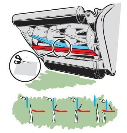 Ein Spindelmäher schneidet mit einer Reihe scharfer, spiralförmig rotierenden Messern. Die rotierende Spindel fängt die Grashalme zwischen seinen sich drehenden Messern und einem feststehenden Untermesser ein und erzeugt einen präzisen, scherenähnlichen Schnitt.