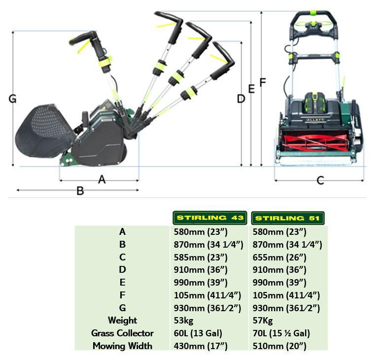 Ausstattungsmerkmale, die man von Alletts Kensington-Reihe erwartetet, sind beim Stirling Standard. Dazu zählen der verstellbare Rasenrechen mit Federzinken hinter der vorderen Stahlwalze, der Vorderradsatz und eine geteilte hintere Walze mit Differenzialantrieb zur Unterstützung des Geradeauslaufs und Reduzierung der Rasenabnutzung beim Wenden.