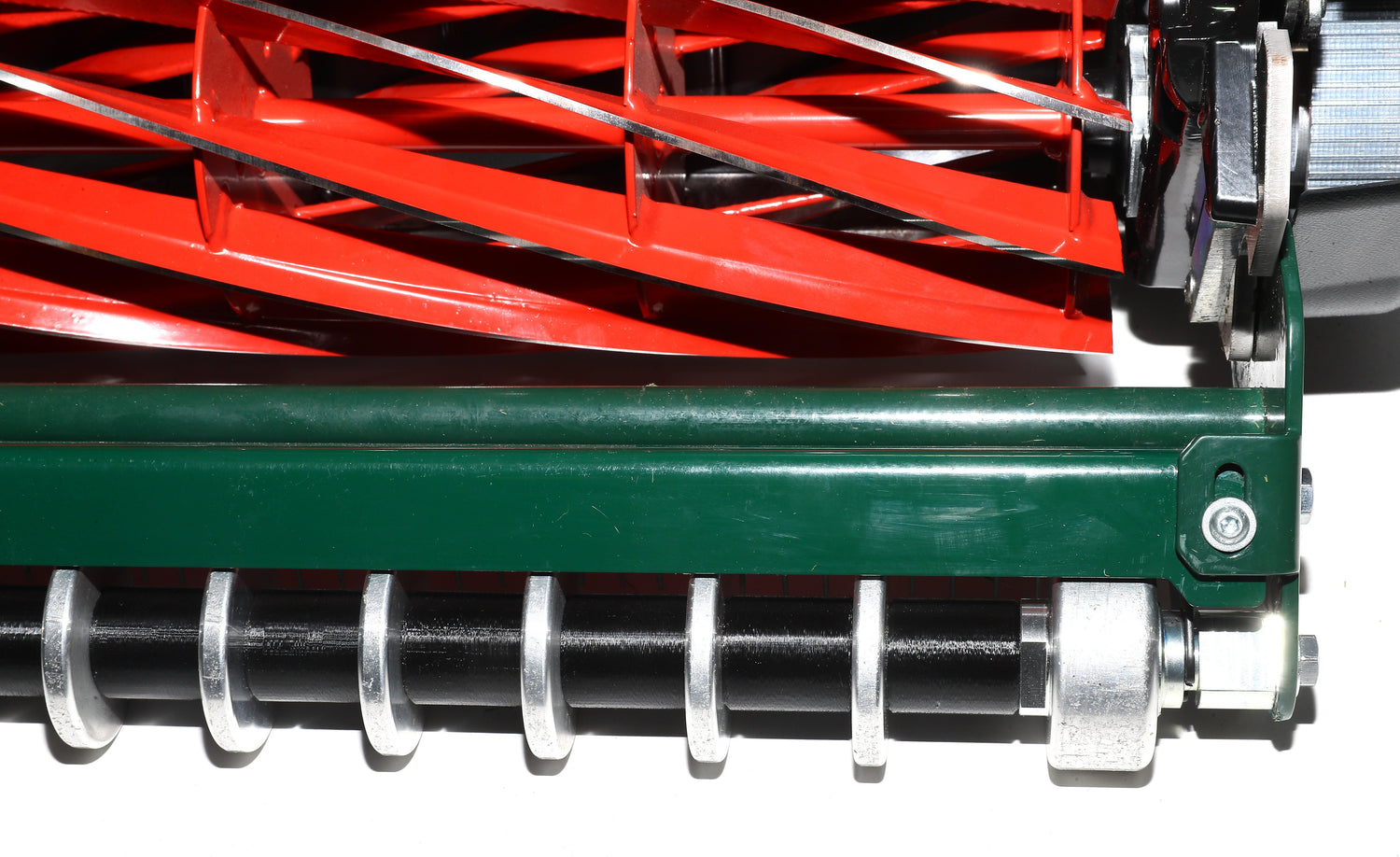 Die 6-Messer-Mähkassette ist serienmäßig. Optional gibt es eine 10-Messer-Spindel inklusive eines dünneren Untermessers mit Vorderkantenschliff, wenn ein noch präziserer Schnitt gewünscht ist, wie bspw. auf Golf- und Bowling-Greens.